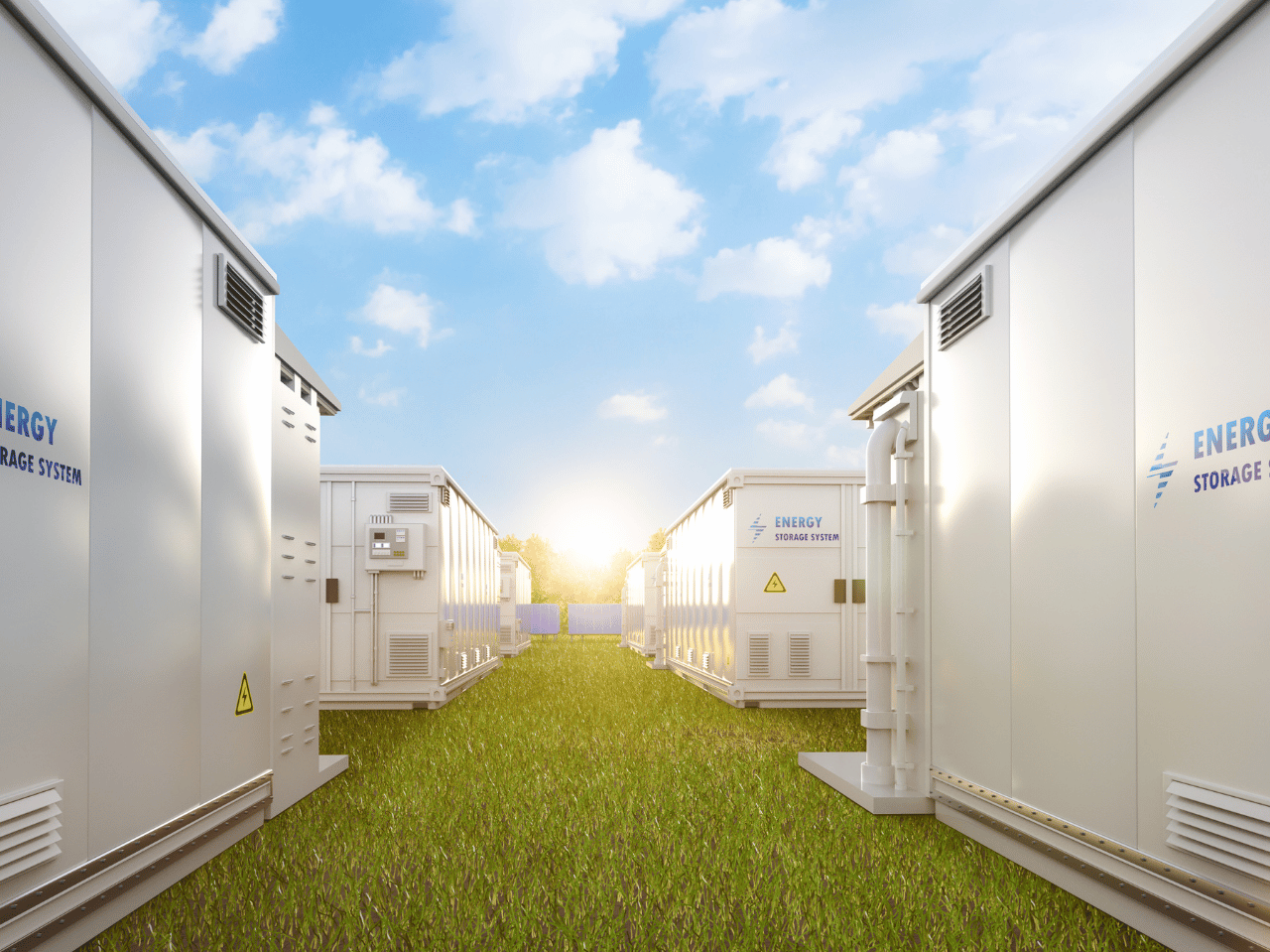 Ein Großspeicher speichert überschüssige Energie aus dem Netz oder aus erneuerbaren Quellen und gibt sie bei Bedarf wieder ab – zur Netzstabilisierung oder zum Handel.